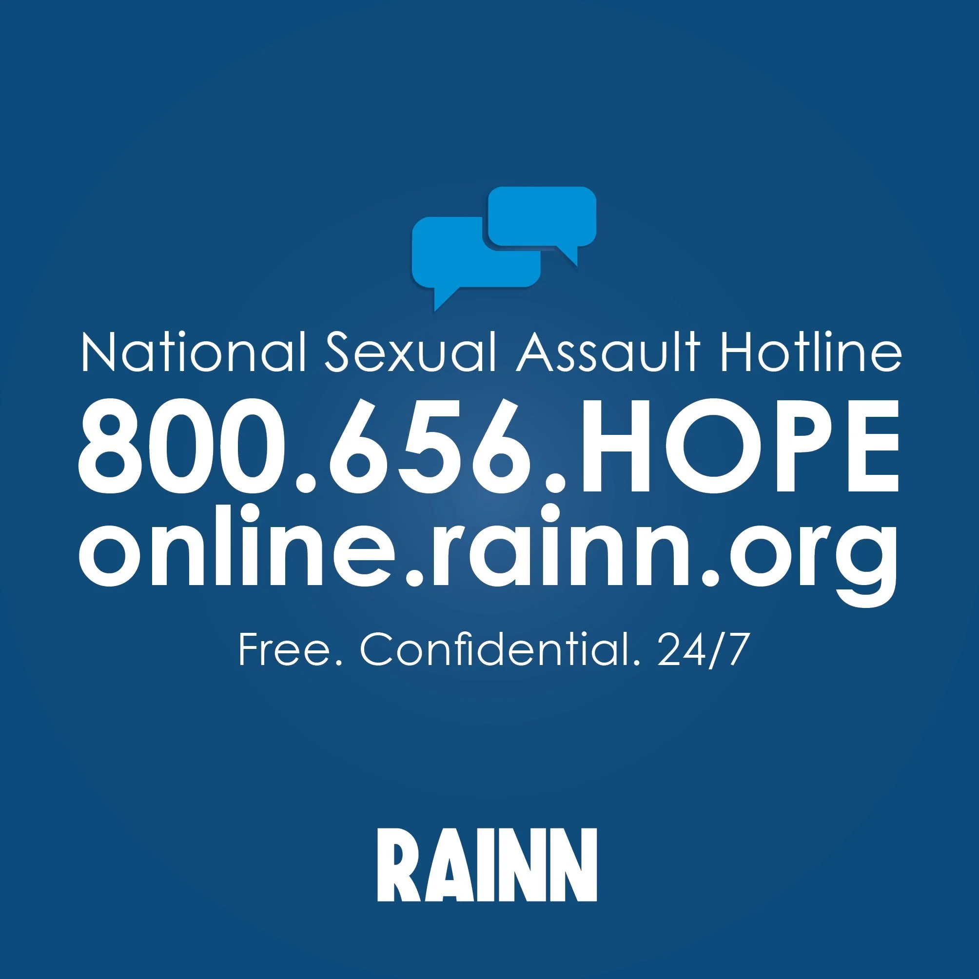 A blue background sign with white text displaying the National Sexual Assault Hotline number 800.656.HOPE, online.rainn.org, and describing it as free, confidential, and available 24/7, with two speech bubbles above the text.
